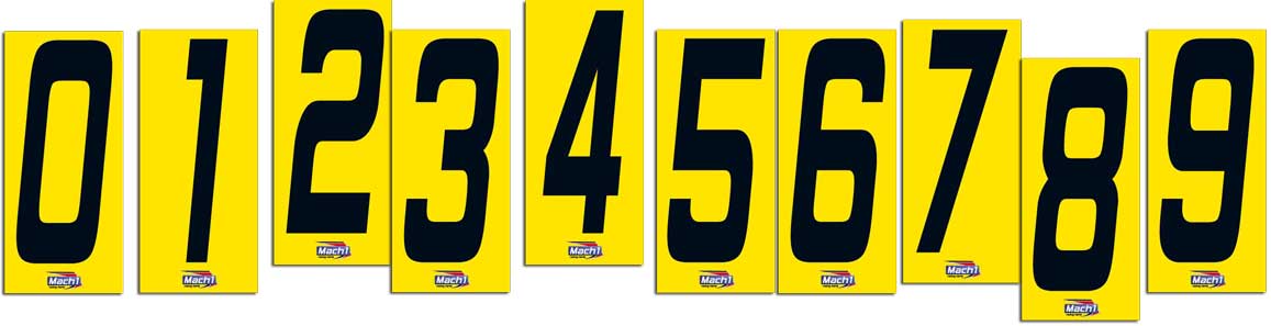 Wetterfeste Startnummern-Aufkleber (Ziffern 0-9) in leuchtendem Gelb, gedruckt auf dünner, flexibler PVC-Folie. Mit einer Ziffernhöhe von 140 mm erfüllen sie gängige Reglement-Vorgaben und haften dank der hohen Flexibilität des Materials blasenfrei und sicher auf allen gewölbten Kart-Plastiksätzen (Frontschild, Seitenkasten, Heckauffahrschutz).